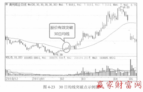 例如,2011年2月中旬,美利紙業(000815)的股價有效突破30日均線后,一直在均線上方運行,一直到6月跌破30日均線才開始出現下跌。如圖2所示。