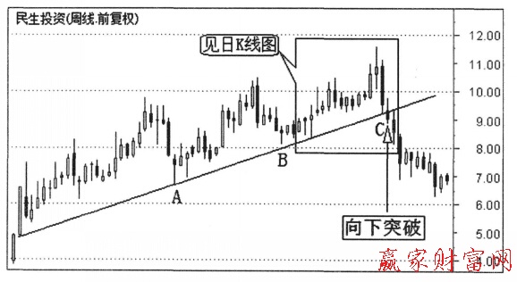 例如,圖1是民生投資(000416)的一段周K線走勢圖。點A和點B組成了這段長期上漲趨勢的趨勢線。當股價第三次創出新高后,回調到該趨勢線時,按照中線波段操作的趨勢線支撐操作方法,C點位置就構成了買人時機。但是股價并沒有像頂期的那樣出現向上的走勢.而是跌破了長期上升趨勢線.此時就需要果斷正報。