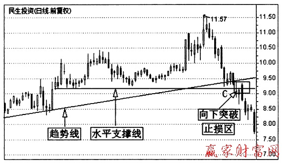 圖2是圖1框線部分的日K線走勢圖。投資者在C點位置買人后,股價在趨勢線附近徘徊3個交易日,隨后以一個向下跳空的方式轉頭向下,當日跌幅達到5%。出現這種走勢.此時就應該采取止損動作。如果對該股還抱有希望的話,向下破位后的第三天.市場出現一根大陰線后,投資者無論如何都要止損。