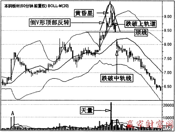 如圖是本鋼板材(000761) 2011年3月15日至2011年5月30日的一段60分鐘K線組合布林線的行情分析圖。在這段短線走勢中,布林線三次開口,三次收口,顯示市場振蕩劇烈。在倒V形頂出現前,股價上漲相對級和,成交量也沒有出現連續退和放大,只有在市場剛剛啟動時出現了短暫且不連續的放l,這只能說明有短期炒作資金介入。