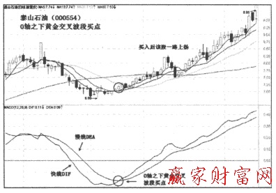 0軸下的黃金交又波段買(mǎi)點(diǎn),實(shí)戰(zhàn)應(yīng)用在個(gè)股泰山石抽(000554)中,如下圖所示。