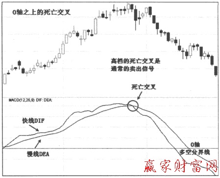 從上圖可以看到,快線DIF與慢線DEA在0軸上同向向上運行.直到指標運行到高檔區,DIF從上向下穿越DEA,發生死亡交叉。在這之后,快線DIF開始帶動慢線DEA向下運行。死亡交叉發生在波段的頂部,是短期的多空平衡點,一旦空頭打破多空平衡.意味著在以后的一段時期內空頭會占優勢,市場有進一步下跌的可能。死亡交叉就像其名字一樣,表示一波升勢的結束.是通常的賣出信號。