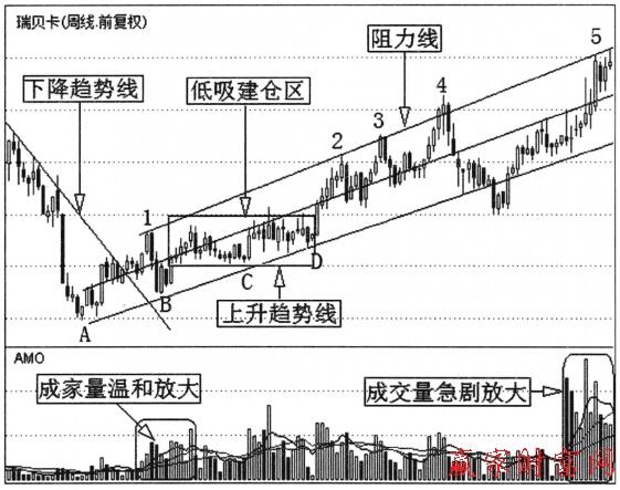 股價兩次反彈,產生的第二個波段低點B高于前期低點A,可以初步判斷該股已經結束了原來的中長期下降趨勢,進人構筑底部階段。在構筑底部過程中,成交量溫和放大,顯示有主力資金開始進入。