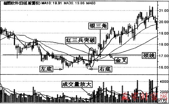 在形成底部過程中,連續出現地址現象。當股價第二次探底達到右底的價位時,K線形成了多根帶長下影線的K線,即底部風高浪大線,這說明股價在此價位獲得支撐,股價無法繼續下跌。隨后股價出現放量反彈,以紅三兵K線形態突破雙底頸線位,成交量連續放大。與此同時,MA10上穿MA30,形成第一個均線金叉。隨后MA10上穿MA60,MA30上穿MA60,形成了銀三角均線形態,表明上升趨勢已經穩定。通過成交量及均線分析,可以發現該雙底形態得到了完全證實,中長線波段操作可以放心買入。
