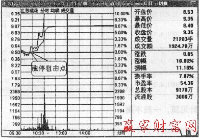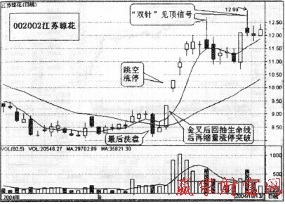 在2004年9月13日最后一次洗盤動(dòng)作之后,出現(xiàn)了向上的攻擊行情。經(jīng)過了洗盤后的平底陽帶上影線的過度。次日2004年9月15日快速飆升,鎖住漲停。這個(gè)過度形態(tài)給人一種反彈受阻的無量無力的假象。主力最想表現(xiàn)出來的意圖越是隱蔽,往往是專業(yè)投資者展開捕捉的信號(hào)。該股從底部第一個(gè)漲停突破向上之后。馬不停蹄向上跳空漲停,快速脫離成本區(qū)域,給人以強(qiáng)大無比的感覺,認(rèn)定是大機(jī)構(gòu)、大手筆操作,給后面順利出貨埋下伏筆。