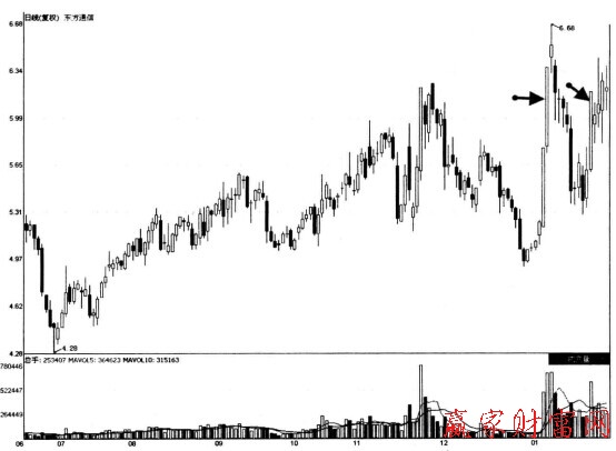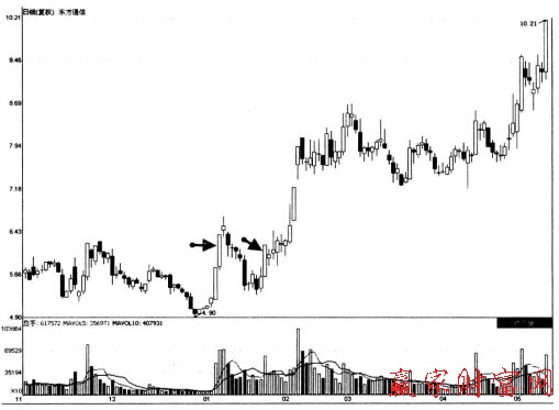 上圖所示為東方通信2010.06.23至2011.01.28期間走勢圖。此股在向上沖擊原來的盤整區(qū)時,出現(xiàn)了這種寬幅展蕩中的再度漲停板形態(tài),這是個股隨后有望突破上行的信號。在實盤操作中,此時,我們可以積極地買股入場。下圖所示為此股隨后的走勢情況。