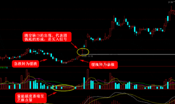 一般出現在市場下跌的后期,行情一般會有多個形態的出現,急速下跌、緩慢下跌、緩慢上漲、跳空暴漲等,這就意味著圓弧底形態已經結束,所以買點就應該在跳空缺口處,底部形成的時間越長,那么買點參考的意義就比較大,之后的漲幅很有可能更直觀。再觀察中長期均線,拐頭向上,后期上漲概率會加大。