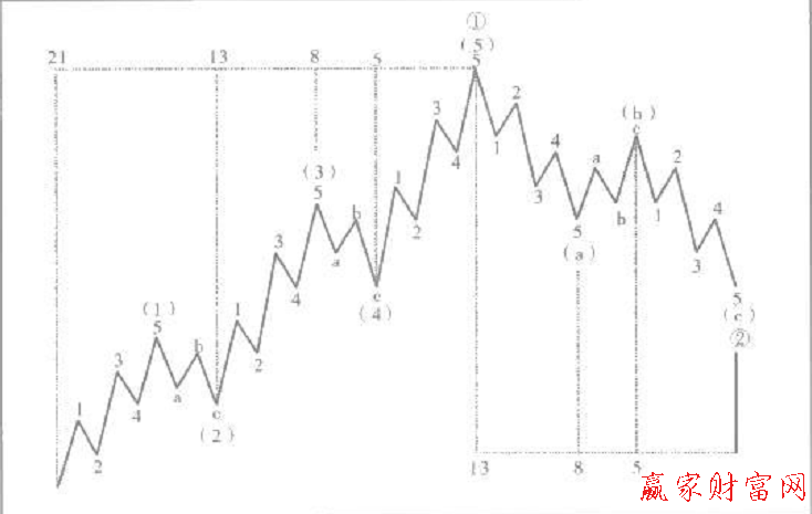 推動浪中,第5浪、13浪以及21浪是市場的高點,每個浪的運行時間相當,在市場中每一個高點都會出現轉折。推動浪的起點開始計算,第34個時間單位上顯示為調整浪的終點。