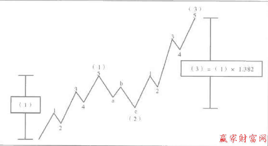 浪3的可能形態(tài)是正常的驅(qū)動浪或者延伸浪。在進行價位預(yù)測時,基本形態(tài)已經(jīng)確定,波浪理論告訴我們第三浪永遠不可能是最短的浪,除非浪1出現(xiàn)延長浪,否則浪3一般要比浪1長,而且出現(xiàn)延長的可能性最大。價位預(yù)測主要參考的是浪1的幅度,但是當浪3出現(xiàn)延長浪時,分析要在浪1的基礎(chǔ)之上展開擴展。