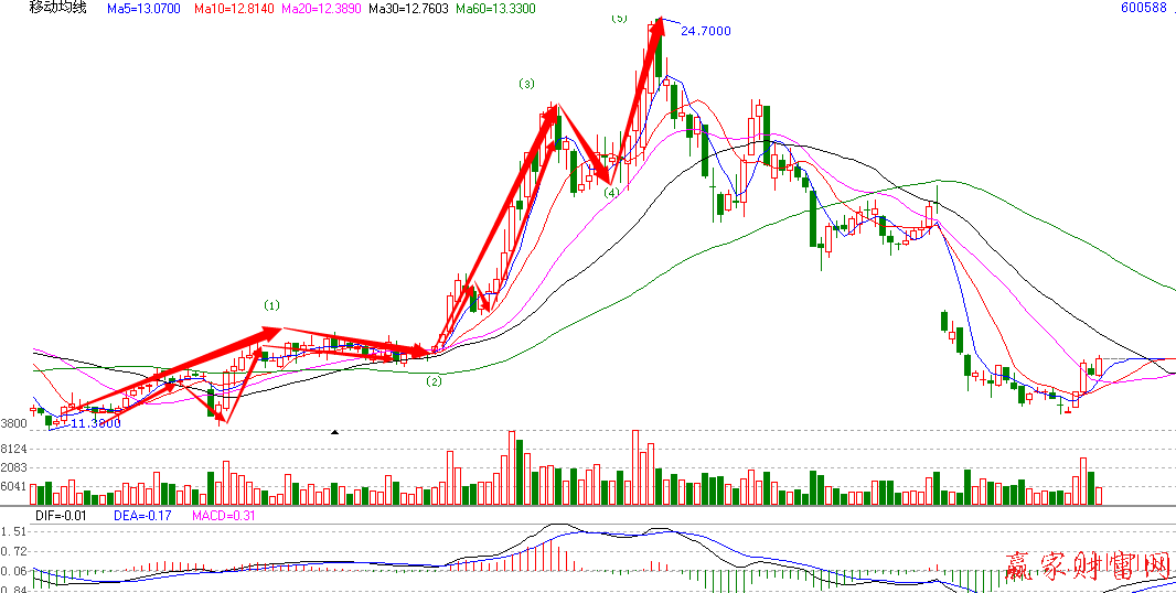 600588用友軟件屬于電子信息個股板塊,2013年12月3日出現(xiàn)11.47的低點,之后連續(xù)小陽線開始拉上,量能放大,能量上漲。繼續(xù)上漲勢頭沒有那么充足,導致后市有小幅回調(diào),均線多頭排列之后首次粘合,盤整之后向上發(fā)散,站穩(wěn)均線,此為較強勁勢頭。浪(1)價位上漲2.94元,浪(3)上漲 8.6313。此時8.6313/2.94=2.94接近2.618的黃金比率。在實踐中浪3時期上升走勢已經(jīng)較為明顯,牛市地位確立,所以目標價位預(yù)測不是很難,意義也不如預(yù)測浪5價位那么深遠。