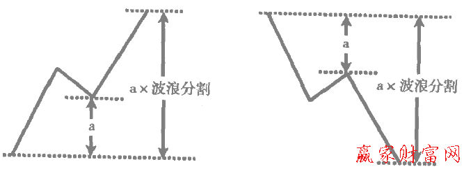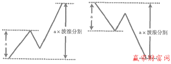 第一,一段趨勢價格上升/下降的幅度乘以波浪分割將會是其后上升/下降波的阻力或者支撐次,如下圖所示。