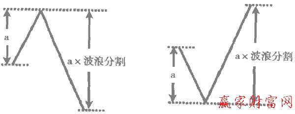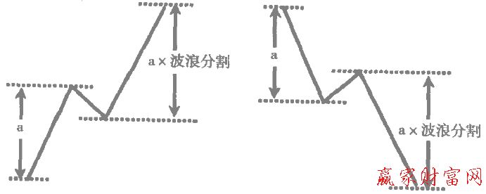 第四,在一段相同的波浪中,a浪或①浪乘以波浪分割將會是c浪及③浪或⑤浪的幅度。如下圖所示。