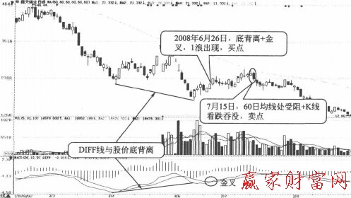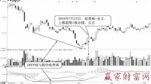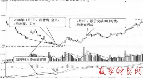 因此,投資者在下跌趨勢(shì)中,一旦見(jiàn)到“DIFF線(xiàn)與股價(jià)底背離+金叉”,就要注意1浪的出現(xiàn)。
