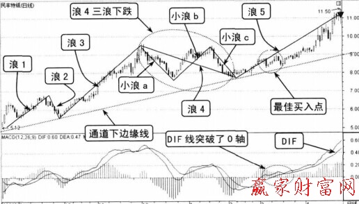 觀察圖中我們可以發(fā)現(xiàn)在浪5的前面部分,MACD線中的DIF指標(biāo)線出現(xiàn)了穿越0軸的現(xiàn)象。在這之后,股價(jià)展開(kāi)了浪5的上漲行情,股價(jià)從8.50元左右,最高上漲到了11.50元,漲幅達(dá)到了35%。