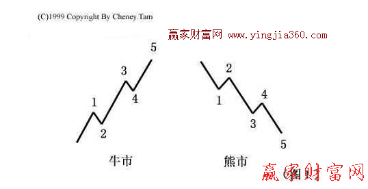 在艾略特波浪理論中,波浪的型態決定了其性質是推動浪還是修正浪。但是每一個浪的型態也不完全一樣。在現實情況中,推動浪會因基本面的不同而出現一些變異型態。但以標準的推動浪來說,它們是五浪推動的,在牛市中是五浪上升,在熊市中是五浪下跌,五浪結束就會運行修正浪(見圖1)。推動浪的變異型態則有數個種類。最初艾略特只提出了“浪的延伸”、“失敗的第5浪”、“傾斜三角形”等類型。后來,又有人進一步指出,還有“第二種傾斜三角形”等形態。