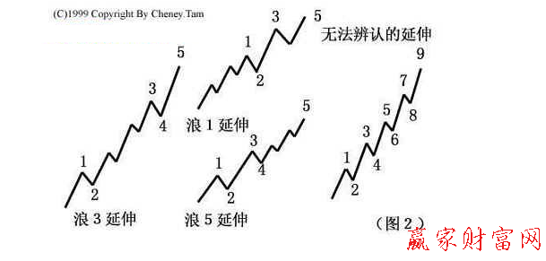 所謂浪的延伸,是指浪的運動發生放大或拉長的現象。當波浪發生延伸時,將會使得此一波浪序列形成大小相似的九浪,而如果延伸浪中再出現延伸,則我們會見到十三個大小相似的波浪。根據我的經驗,在現實中波浪的延伸是經常出現的,也許在未來,浪的延伸會被認為是推動浪的正常型態。如果在分析中無法辯認是哪一個波浪出現延伸,這不要緊。因為在艾略特的理論體系中,五浪、九浪與十三浪甚至十七浪的意義是一樣的(見圖2)。我們所關心的是波浪的延伸到底給予我們什么好處。一般情況下,三個推動浪中有且僅有一個浪出現延伸。這個事實,使波浪的延伸現象變成了預測推動浪運行長度的一個相當有用的依據。舉例來說,如果投資者發覺第3浪出現延伸時,那么第5浪理應只是一個和第1浪相似的簡單結構。或者,當第1浪與第3浪都是簡單的升浪,則有理由相信第5浪可能是一個延伸浪,特別是當成交量急劇增加時。請注意,在成熟的股市,延伸浪經常會出現在第3浪中;而在新興股市中,第5浪往往也出現延伸的現象。