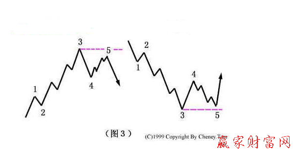 推動浪可以延伸,也可以失敗。艾略特使用“失敗型態”的字眼,藉以描述第5浪的運動未能突破第3浪終點的價格水平。也有人使用“未完成的第5浪”這個詞表達上述意思(見圖3)。我認為,如果不使用“失敗的”這個詞,則不如使用“未創新高(低)的”。因為“未完成的”很容易讓人誤以為第5浪尚未結束。