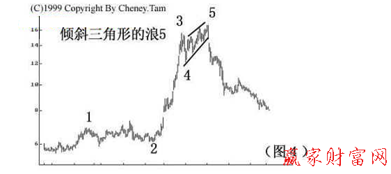 當第5浪不能創新高(低)時,很可能市場會出現大逆轉。其包含的深層意義,并非在此三言兩語所能說得清楚。要特別提醒讀者的是,在實戰應用中一定要注意第5浪中的次一級5個小浪清晰出現后才可確認此“失敗5浪”。否則,可以演變成“4浪b”,只要它是3浪運行的。“失敗的第5浪”的出現,大多數情況下是由于基本面出現突然的重大變化而造成的。例如,利率變動、戰爭、政變等。不過,單有基本面的變化而第3浪沒有過分揚升的話,則也很難令第5浪失敗。正如現實世界難以完美一樣,股市也經常會出現令人遺憾的地方。除了“延伸”和“失敗”之外,傾斜三角形型態也是推動浪的變異型態。相對前兩者來說,這確實是較為少見的。艾略特認為,傾斜三角形為推動浪中的一種特殊型態,主要出現在第5浪的位置。
