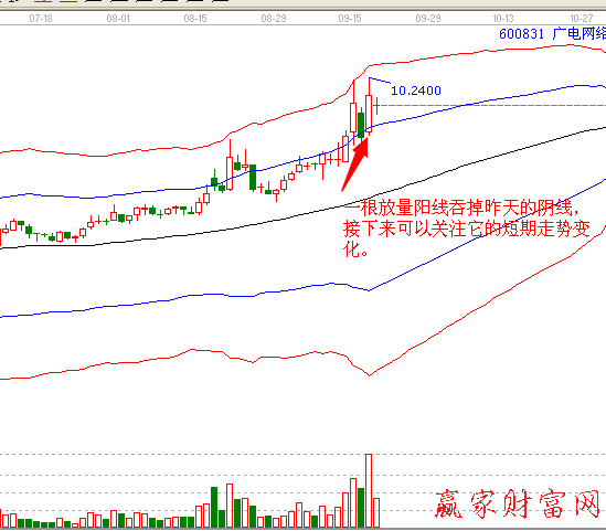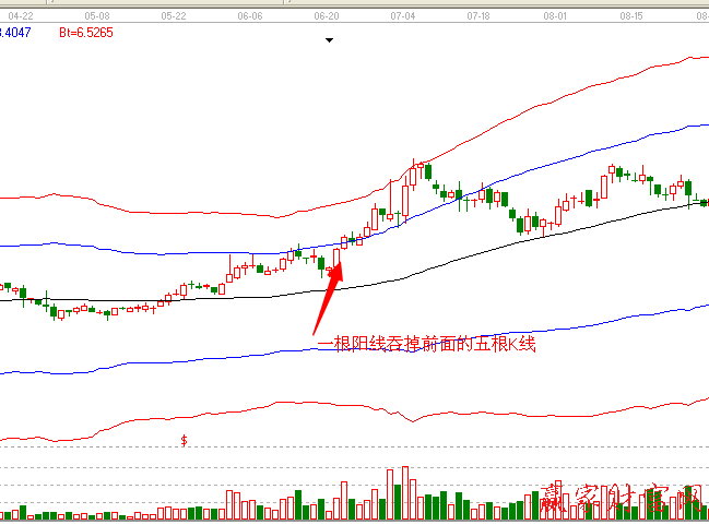 如上圖的K線圖解中,在經(jīng)過一段時(shí)間的下跌行情之后出現(xiàn)了這種多頭吞噬的形態(tài),出現(xiàn)之后,就走出了一段上漲的行情。該股的一根K線吞掉前面的多根K線,而且是伴隨著量能的放大,是個(gè)明顯的看漲信號(hào),從圖中可以看到該股在吞噬掉前面幾根K線之后,第二天就站上了圖中的極反通道上軌線,這個(gè)低位是個(gè)很好的介入點(diǎn)位,從圖中可以看到接下來股價(jià)在短短的幾個(gè)交易日內(nèi)漲幅達(dá)到10個(gè)點(diǎn)以上。
