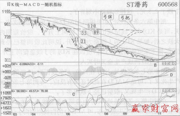 圖中此股還是“ST潛藥”,其實,該股早已經不是ST股票了。從2007年12月31日開始,每股收益已經達到0.17元了。所以在第三條豎線后,股價不斷上漲,均線系統緩緩上行,這樣的形態是牛股。