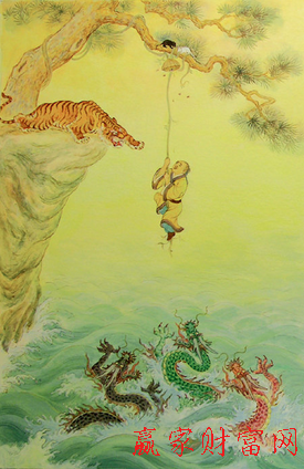 但是顯然迷失了方向,旅人竟然跑到一座斷崖絕壁的頂上。在冷汗淋淋毫無頭緒之中,看到斷崖上有一棵松樹,并且發現從樹枝上垂下一條長長的藤蔓。于是旅人便毫不猶豫跳了過去,抓著藤蔓垂下去,可謂九死一生。