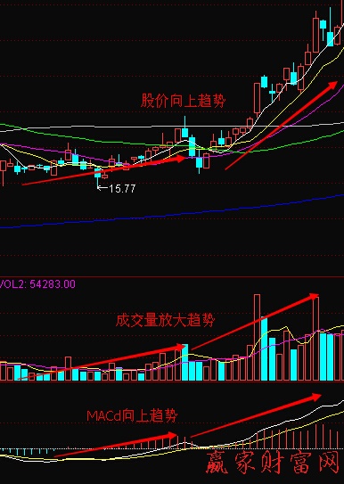 上圖即為一種情況下的MACD趨勢和成交量趨勢的對比。上圖中股價前期底部震蕩,但是股價逐步震蕩向上,此時成交量時大時小,但是總體趨勢呈現出放大的趨勢;MACD此時在零軸下震蕩,形成了一個堅固的底。MACD和成交量結合之下說明股價底部震蕩,并且是逐步向上的,股價隨時啟動上攻,是買入的機會。股價有震蕩向上之勢后,MACD穿過零軸進入徹底的強勢區,成交量放大更劇烈,此時便進入了股價上漲的劇烈期,是快速買入的時機。如圖所示,隨后成交量劇烈放大,MACD趨勢向上,股價直線拉升。