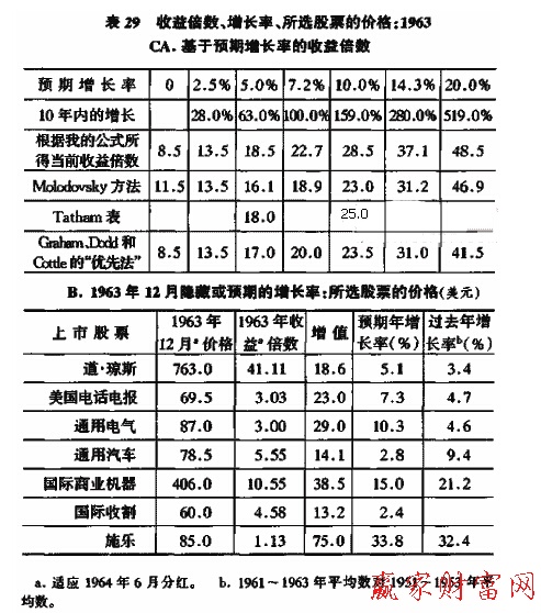就那些書籍有廣闊前景并因此而表現得最熱門和有最高價值的公司來說,很明顯不能這樣做。想想施樂公司,在1964年后期以132美元賣出,這個投機成功的公司因此在市場上擁有27億美元的價值。這個數字依次是1963年銷售額的10倍、利潤的117倍、每股不足3美元的凈有形資產的約50倍。我的主要論點是,作為真正的投資,不能買那種價格的普通股和同一水平的其他股,除非投資和投機混合在一起,投機占了統治地位,或對自己真正的購買動機含混不清。