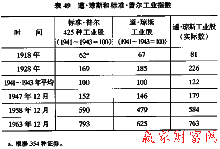 在這方面,道.瓊斯工業(yè)平均指數(shù)的制定和運(yùn)作很像典型的防御型投資者,這些投資者焦慮于維持和改善他選擇的證券質(zhì)量,因而周期性地所了解的證券重新進(jìn)行選擇。這樣的選擇效益如何呢?一個(gè)簡(jiǎn)單的測(cè)試可以用來(lái)比較包括替代效果在內(nèi)的平均價(jià)格和沒(méi)有作出改變時(shí)它將會(huì)擁有的價(jià)值。我們也可以比較道.瓊斯價(jià)值的進(jìn)展和其他的經(jīng)過(guò)很多年仍穩(wěn)定持有的價(jià)值。后者指標(biāo)準(zhǔn).普爾354種(后來(lái)為425種)工業(yè)股票,這些股票從1918年起開始統(tǒng)計(jì)。結(jié)果如表49所示。