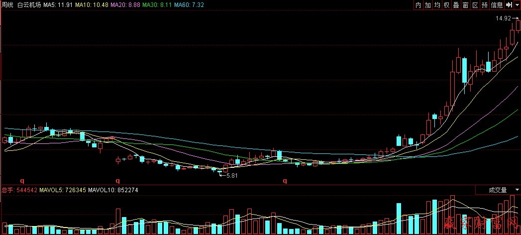 (6)周K線圖中,5周、10周、20周均價(jià)線對市場形成支撐和5周、10周、20周均量線的支撐更有底部確認(rèn)作用。