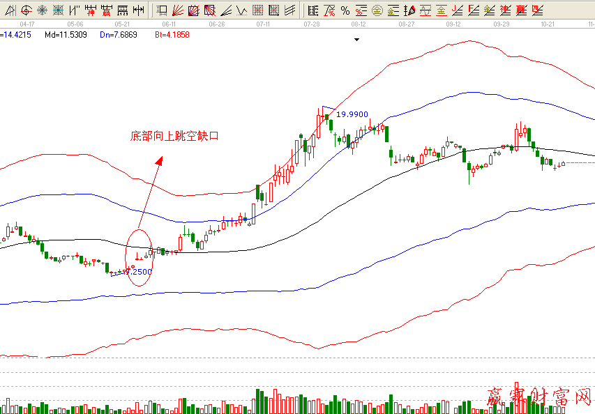 股價在經(jīng)過較長時間的下跌和底部完成之后,某日股價突然向上跳空高開并與前一日的股價之間留下一個未成交區(qū)域,缺口在短期內未予回補,這通常是該股開始進入拉升階段的標志,顯示短期內應有一定的升幅,是最佳的買入時機。