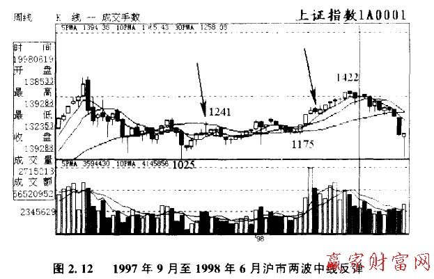 1997年9月23日 ,滬市經19周下調,從1510.17點調整至1025. 13點。其后迅即反彈至1 241.83點眨彈空間為216.66點。然后在1998年3 月至6月的反彈中。從1175 .55點反彈至1 422.97點見頂,反彈了247. 42點。