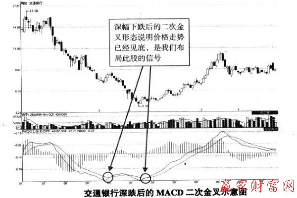 圖中標(biāo)注所示,可以看到在刺骨的下跌途中,MACD指標(biāo)窗口中的DIFF線(xiàn)始終運(yùn)行在DEA線(xiàn)的下方,從周K線(xiàn)的MACD形態(tài)中,我們可以清晰的看到下跌趨勢(shì)的運(yùn)行,隨后,在深幅下跌后,DIFF線(xiàn)開(kāi)始向上穿越DEA線(xiàn),顯然,第一次穿越是不成功的,DIFF線(xiàn)并沒(méi)有有效地運(yùn)行于DEA線(xiàn)的上方;但是第二次的穿越卻極為有效,它已開(kāi)始明顯地運(yùn)行在DEA線(xiàn)的上方,且這是股價(jià)也出現(xiàn)了止跌企穩(wěn)的形態(tài),這是MACD的二次金叉形態(tài)。