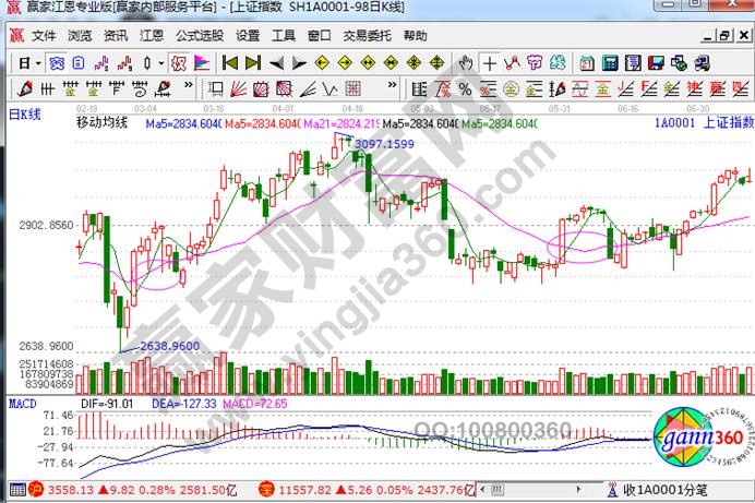在均線指標中,5日均線是最能夠判斷漲跌動能強弱的一條均線,所以它又被稱為是漲跌動能線,而本文所要說的21日均線,它則是進出決策線,在相應的實戰圖形中,它的作用是簡單那有效的,而且21日均線單獨用起來的時候也能夠做到輕松操盤的。當然這兩條線如果集合起來,那就更能夠發現其中的定律。我們來看一下上證指數走勢圖。