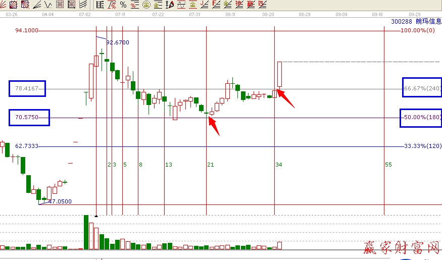 首先我們以92.67為起點(diǎn)畫百分比,再以92.67當(dāng)天7月4號為起點(diǎn)畫費(fèi)氏時間循環(huán)線,完成一個股票的時間和價格分析圖形。