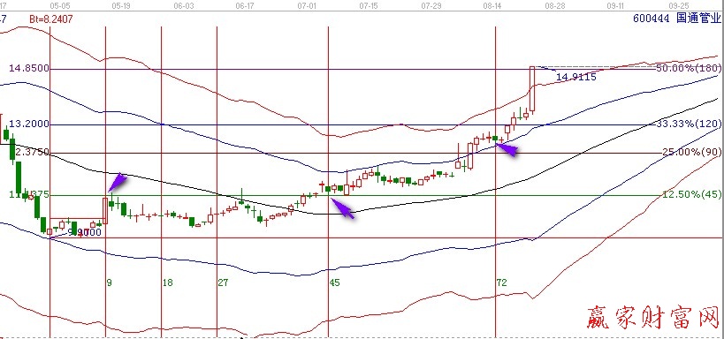 在圖中運用有三個工具,時間工具——費氏時間周期線;價格工具——江恩價格百分比;趨勢工具——極反通道。國通管業(yè)具體操作是符合極反通道一種買點,那就是超跌反彈的買點。在2014年4月29日出現(xiàn)了階段性的低點,這個位置正好在極反通道的下軌線位置獲得支撐。因為做時間工具的時間我們選點是這個低點和之后的高點位置,我們不在這位置作分析。