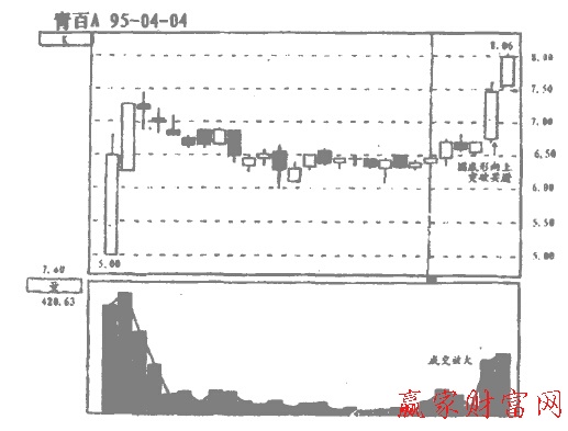 在實戰中,根據圓頂(底)決策買賣首先要注意的是思維方向。當圓頂形態跡象出現,思維上應先考慮賣出而不是買進,一旦向下突破,清倉離市為上策,若投資者在下跌趨勢形成時賣出,可以避免30%左右的跌幅所造成的損失,保存了實力,為以后抄大底提供了必不可少的資金條件。少虧30%,下跌之后又增加獲利30%的機會,正反累計幅度己非常之大.而圓底出現時留意買進機會又非常重要,1995年4月,青百A經過20天左右的波動形成一個圓底形態,在大勢沒有什么行情的形態下,青百A發力向上40%左右(如圖3-6), 5月18日發動行情之前,青百A再度呈現圓底式移動.隨后兩日股價由6元多升至12元以上,升幅接近100%。上述事例顯示,圓形頂(底)在實戰中能夠有效地幫助我們選擇買賣時機。從圖表上看,n次突破出現必然伴隨量的放大,所以,研判突破是否成立還應注意量的變化.