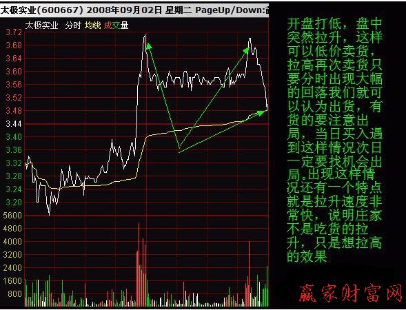 3.低開盤中突然拉升到高位回落并出現(xiàn)大量,事實上.這是莊家故意做出來的,目的就是為了引起投資者關(guān)注,利于莊家出貨,如下圖。