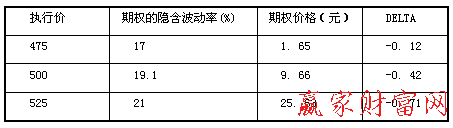 建立的反套利,由于0. 71÷0.42≈1.7,因而買入2手執行價為500的看跌期權,賣出1手執行價為525的看跌期權,總頭寸DELTA為-0.13,總共盈余6.31點,即盈余631。若標的資產價格到期時在525上方,所有期權無價值過期,所獲盈利為初始盈余;若標的物價格剛好等于買入期權執行價,該策略面臨最大虧損: