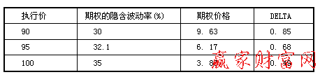 由于0. 85÷0.49≈2,故買人1手執行價為90的看漲期權,賣出2手執行價為100的看漲期權,初始投資成本為1. 91點,即191,總頭寸DELTA為-0.13。若標的資產價格到期時低于90,所有期權無價值過期,則虧損191;若標的物價格等于100,賣出的期權無價值過期,則獲得最大潛在盈利10 x100 -191= 809;上行損益平衡點為100+ 809÷100≈108。