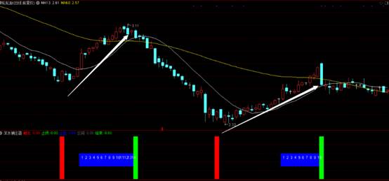 當(dāng)出現(xiàn)如上面的綠柱的信號(hào)時(shí),此時(shí)就是我們的止損或者清倉(cāng)時(shí)機(jī)。當(dāng)然在這之外的灰柱,那么就是本波段的過(guò)程之中,藍(lán)色小框內(nèi)數(shù)字是已經(jīng)達(dá)標(biāo)已收益5%點(diǎn)的持續(xù)天數(shù)。