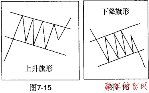 換句話說,上升旗形從圖形看,一波比一波低,空頭力量占上風,最后,多頭力挽狂瀾,使股價突破盤局的上界線,繼續展開另段上升行情。下跌旗形則從圖形看,一波比一波高,多頭力量居主動,最后,空頭全力打壓,使股價突破盤局的下界緣,繼續展開另段下跌行情。
