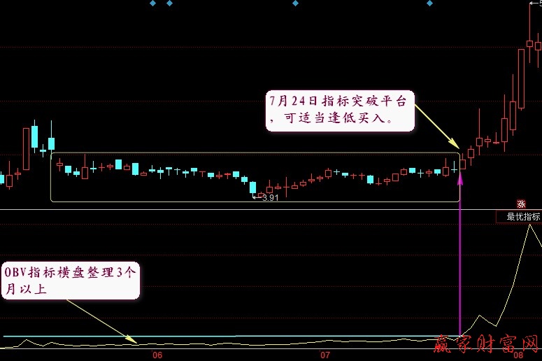 對(duì)OBV指標(biāo)熟悉的朋友大多也知道如何利用該指標(biāo)進(jìn)行股票的買賣,筆者今天就介紹其中一種買入方法,即OBV指標(biāo)橫盤整理時(shí)間超過3個(gè)月,突破整理區(qū)間時(shí)即可買入股票。具體如下: