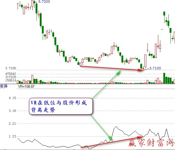 另外,當底背離開始時,VR線的位置越低,該形態的看漲信號就越可靠。VR指標與股價在低位持續背離的時間越長,背離次數越多,則該形態的看漲信號也就越強烈。同時,投資者在操作的時候可以結合成交量及其他技術分析指標,尋求多指標共振,更精確把握買賣。