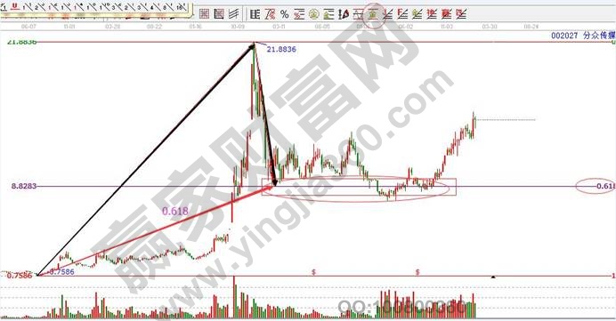 你需要花一些時間,才能理解在斐波那契回退位置所在區域中股價的運行情況。正如上圖中的分眾傳媒股價走勢,在股價創出歷史新高之后的急速殺跌,直接將股價殺跌至0.618區域,雖然市場在此位置反彈,或震蕩,但是該位置附近形成的堅定底部卻是毋庸置疑的。