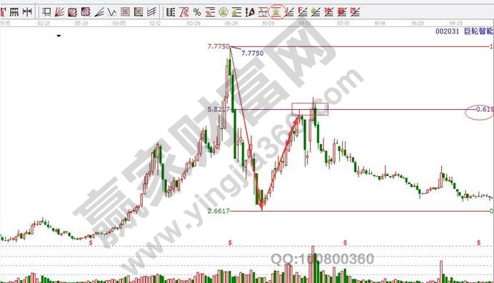 趨勢反轉精確的發生在0.618位置的情況,確實存在。但是并不是每一次反轉都準確的發生于0.618位置。因此,我們應該重視研究,股價在0.618回退位置附近區域的股價運行情況。如果股價在這個區域中趨勢發生停滯或破位下跌,那么就說明0.618位置對于當前股價運行是一個有效的阻力位。我們應該學會在重要斐波那契位置,如0.618回退位置,識別這種信號的能力。