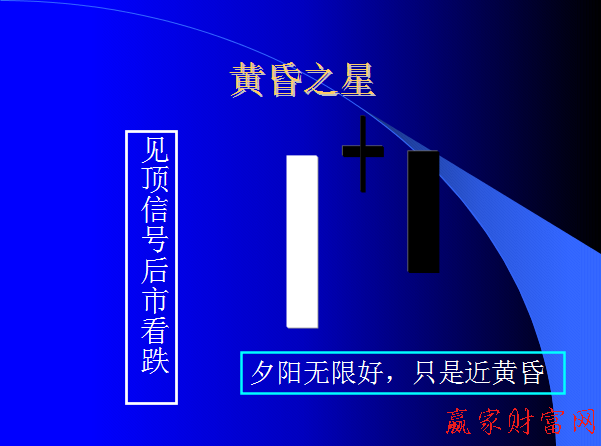 黃昏之星:市場(chǎng)在持續(xù)的漲勢(shì)之后,已激情不再,就像再好的筵席也有散場(chǎng)之時(shí)。黃昏之星的圖形,預(yù)示市場(chǎng)趨勢(shì)已經(jīng)見(jiàn)頂,賣出的時(shí)機(jī)悄然來(lái)監(jiān)。