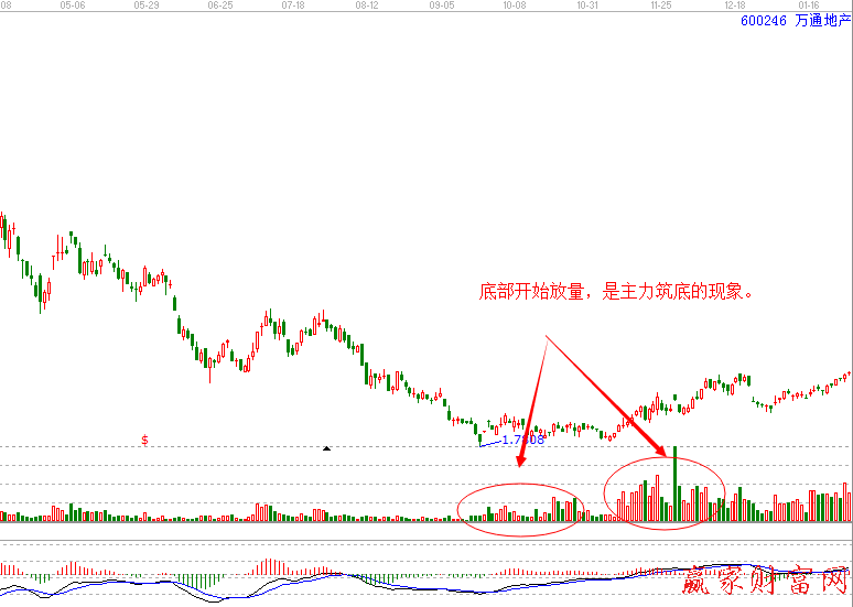 低位放量滯漲指股票經過長期的下跌,突然有幾天出現的量能大幅超過前期量能,但是價格卻沒有明顯上升,或繼續小幅下跌,股價的上漲幅度與成交量的幅度不相匹配,一般碰到這樣的情況是由于主力試盤的跡象,看拋壓的大小,碰到這樣的股票,應多加關注,一旦時機成熟或碰到利好出現,配合量能的放大,這只股票就是未來的大牛股。