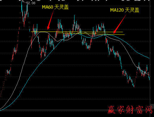 如果一只股票在大幅上漲后出現MA60天靈蓋和MA120天靈蓋時,則說明股價很長時間沒有再創新高了,而是維持在一個高位盤整,且重心已經下移,那么說這里是頭部區間也就順理成章了。