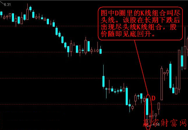 這里要注意的是在股市中,標(biāo)準(zhǔn)的盡頭線出現(xiàn)的機(jī)會(huì)并不多,大多數(shù)情況下出現(xiàn)的都是不太標(biāo)準(zhǔn)的盡頭線(如第二根K線的上下影線較長(zhǎng),但只要它的實(shí)體較短,且完全被第一根K線的影線所包容,也可以看作是盡頭線),這種不太標(biāo)準(zhǔn)的盡頭線所發(fā)出的股價(jià)轉(zhuǎn)向信號(hào),對(duì)投資者仍然有相當(dāng)?shù)膮⒖純r(jià)值。
