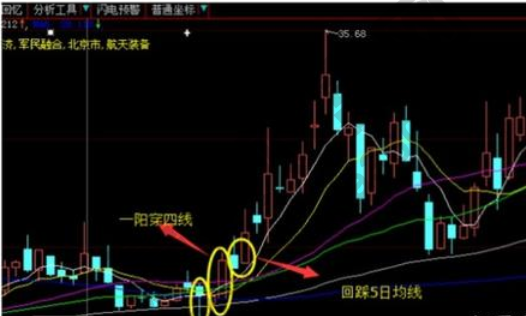 一陽穿4線,行情走勢處于反彈,長實體大陽線出現,突破上述四條平均線的范圍,這種信號比較可靠。